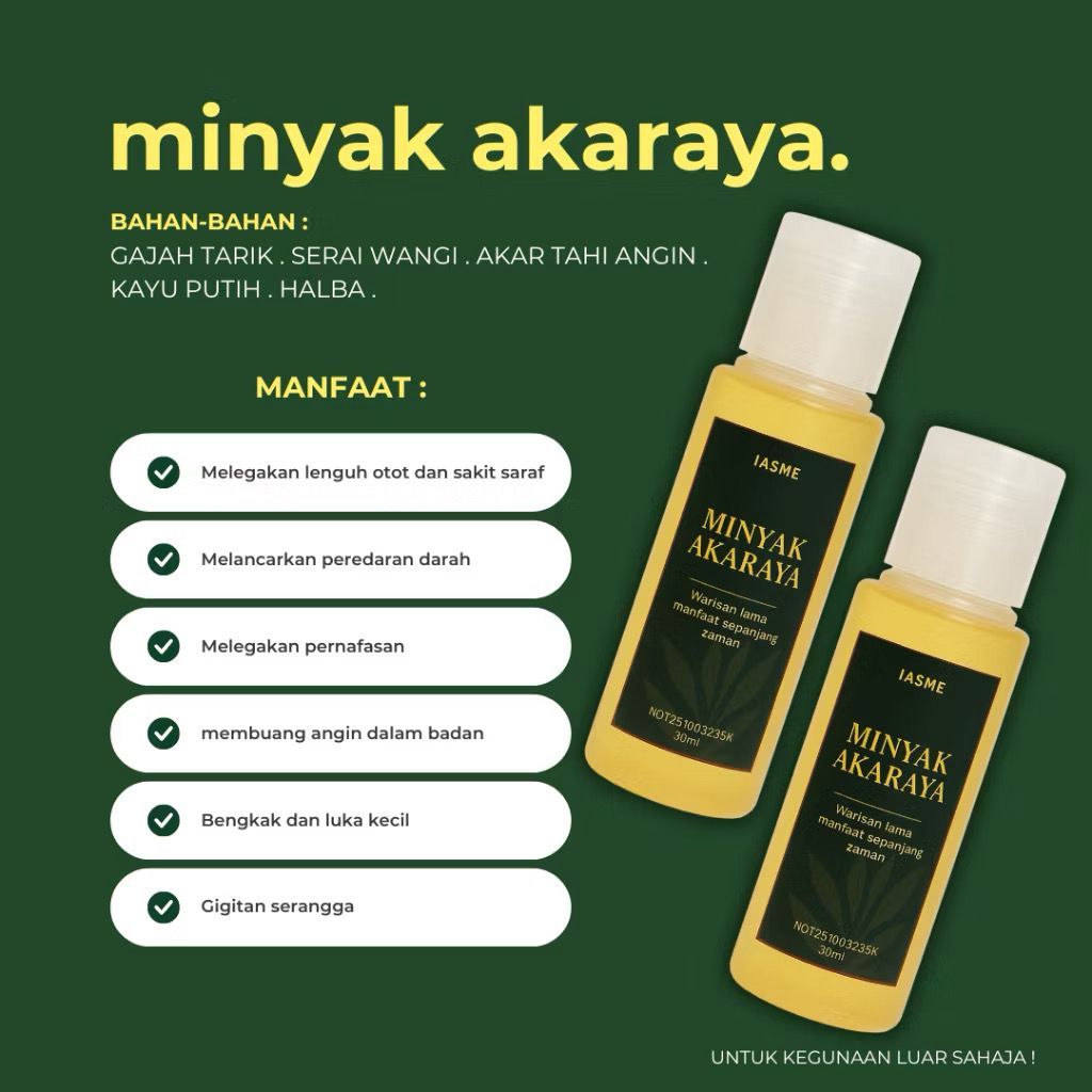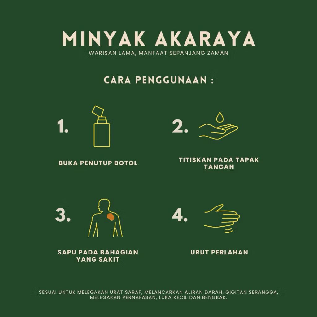 Minyak Akaraya Original – Legakan Lenguh Otot, Sakit Urat, Angin Badan & Saraf Tidak Selesa